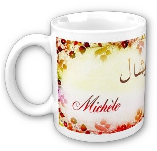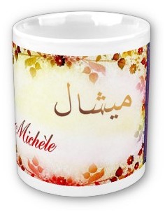 Mug avec le prénom "Michèle" calligraphié en arabe (ميشال) ainsi que son épellation lettre par lettre en arabe.