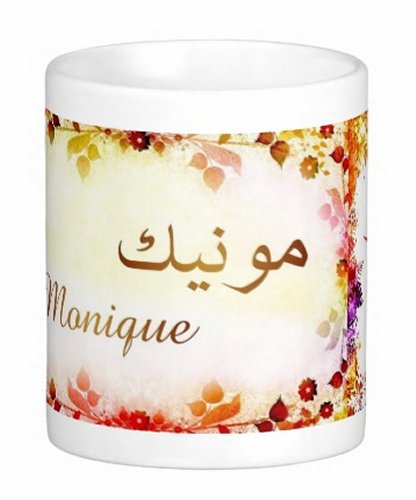Mug avec le prénom "Monique" écrit en français, en arabe (مونيك) et calligraphié de façon artistique en arabe sur la partie droite.