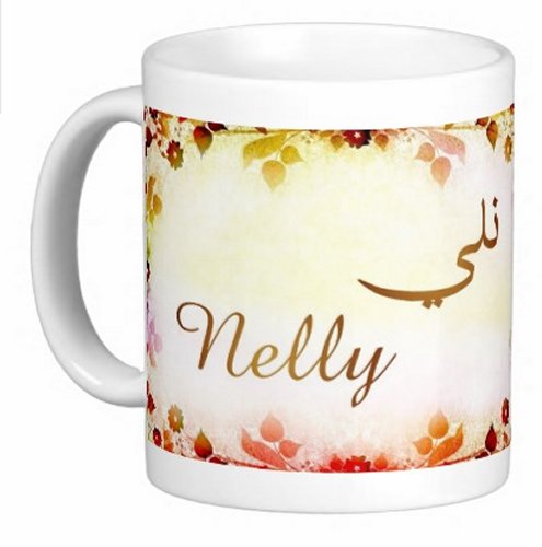 Mug avec le prénom "Nelly" écrit en français, en arabe (نلي) et calligraphié de façon artistique en arabe sur la partie droite.