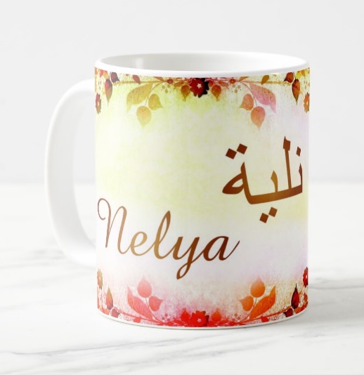 Mug avec le prénom Nelya calligraphié en arabe ainsi que son écriture normale en arabe (نلية) et en français.