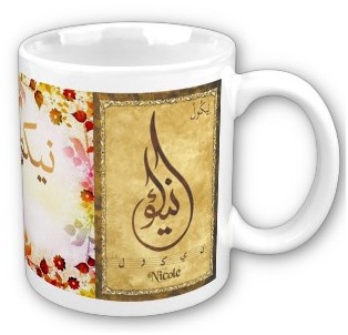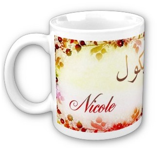 Mug avec le prénom "Nicole" calligraphié en arabe (نيكول) ainsi que son épellation lettre par lettre en arabe.