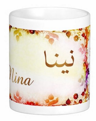 Mug avec le prénom "Nina" écrit en français, en arabe (نينا) et calligraphié de façon artistique en arabe sur la partie droite.