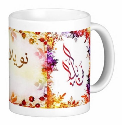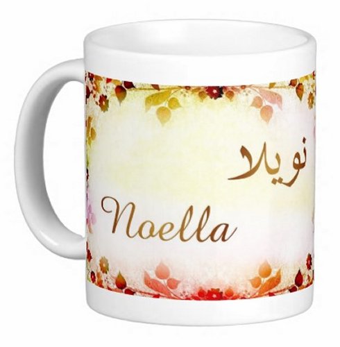 Mug avec le prénom "Noella" écrit en français, en arabe (نويلا) et calligraphié de façon artistique en arabe sur la partie droite.