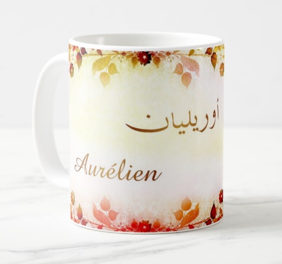 Mug avec le prénom "Aurélien" écrit en français, en arabe (أوريليان) et calligraphié de façon artistique en arabe sur la partie droite.