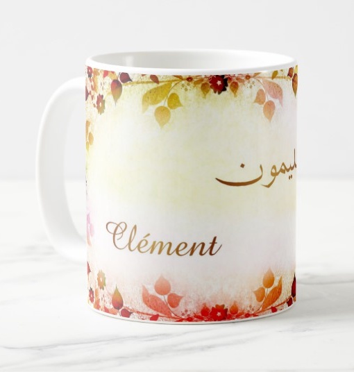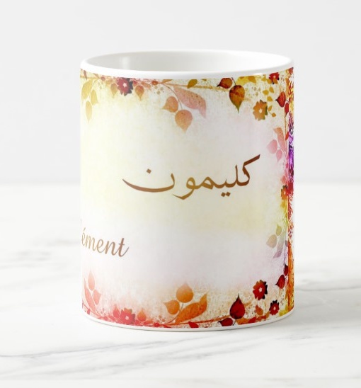 Mug avec le prénom Clément calligraphié en arabe ainsi que son écriture normale en arabe (كليمون) et en français.