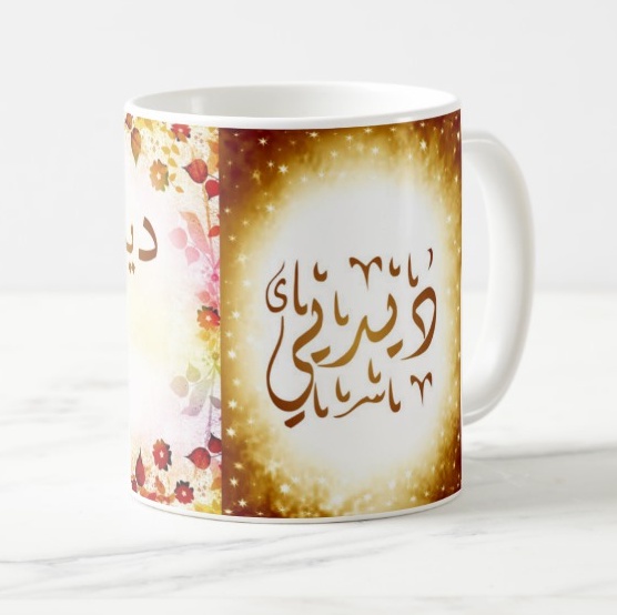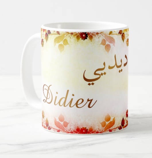 Mug avec le prénom "Didier" écrit en français, en arabe (ديديي) et calligraphié de façon artistique en arabe sur la partie droite.