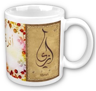 Mug avec le prénom "Henri" calligraphié en arabe (انري) ainsi que son épellation lettre par lettre en arabe.
