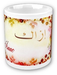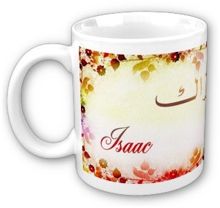 Mug avec le prénom "Isaac" calligraphié en arabe (ازاك) ainsi que son épellation lettre par lettre en arabe.