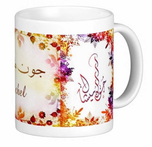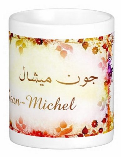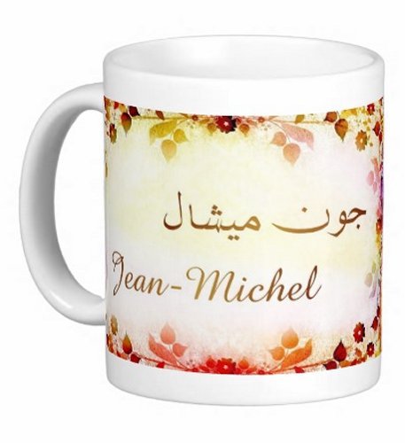 Mug avec le prénom "Jean-Michel" écrit en français, en arabe (جون ميشال) et calligraphié de façon artistique en arabe sur la partie droite.