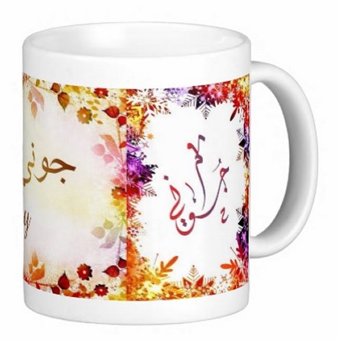 Mug avec le prénom "Johnny" écrit en français, en arabe (جوني) et calligraphié de façon artistique en arabe sur la partie droite.