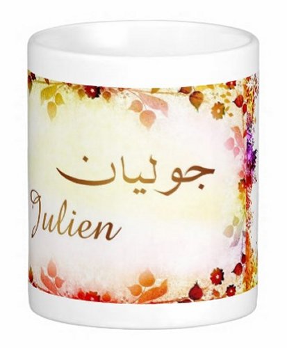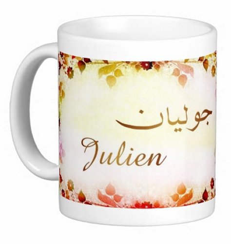 Mug avec le prénom "Julien" écrit en français, en arabe (جوليان) et calligraphié de façon artistique en arabe sur la partie droite.