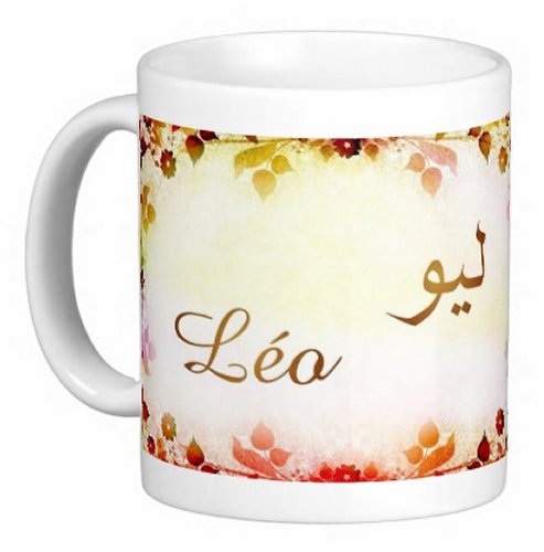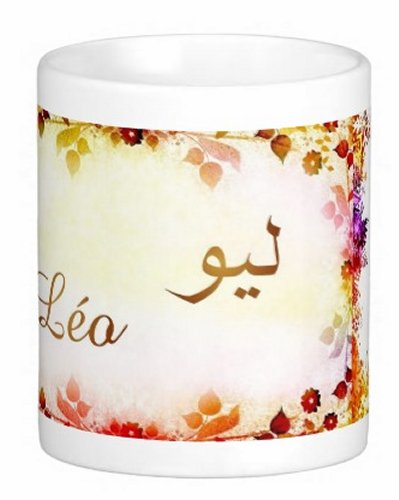 Mug avec le prénom "Léo" écrit en français, en arabe (ليو) et calligraphié de façon artistique en arabe sur la partie droite.