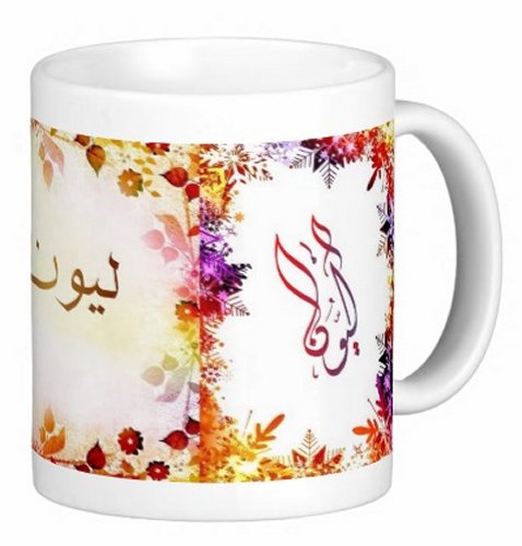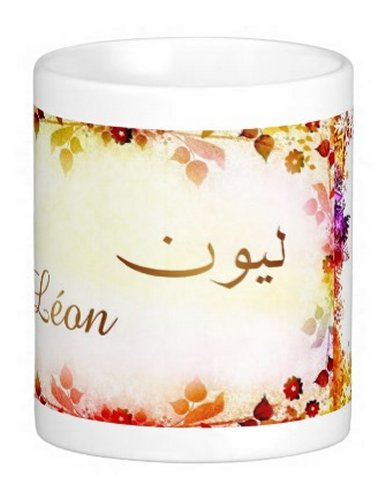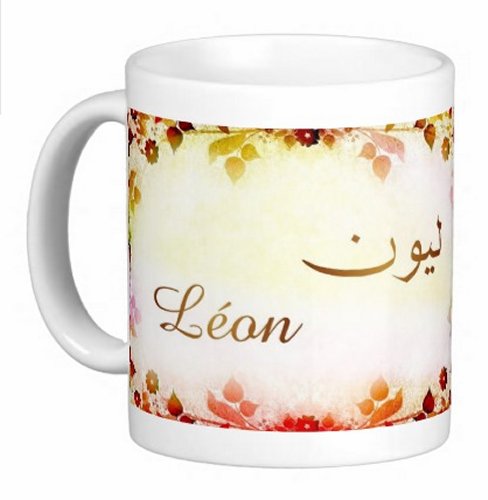 Mug avec le prénom "Léon" écrit en français, en arabe (ليون) et calligraphié de façon artistique en arabe sur la partie droite.