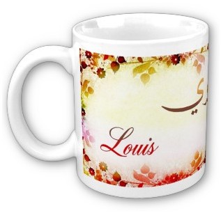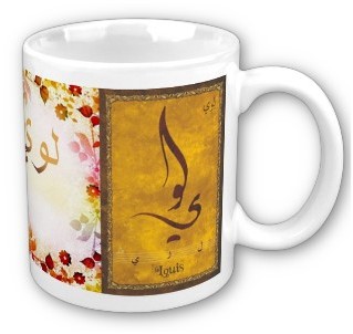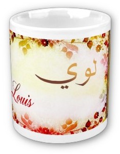 Mug avec le prénom "Louis" calligraphié en arabe (لوي) ainsi que son épellation lettre par lettre en arabe.