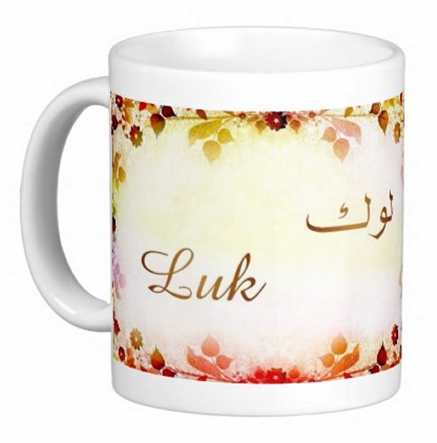 Mug avec le prénom "Luk" écrit en français, en arabe (لوك) et calligraphié de façon artistique en arabe sur la partie droite.