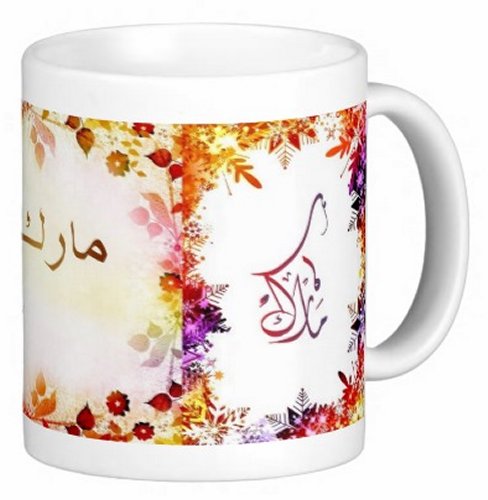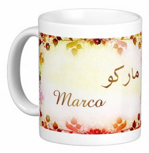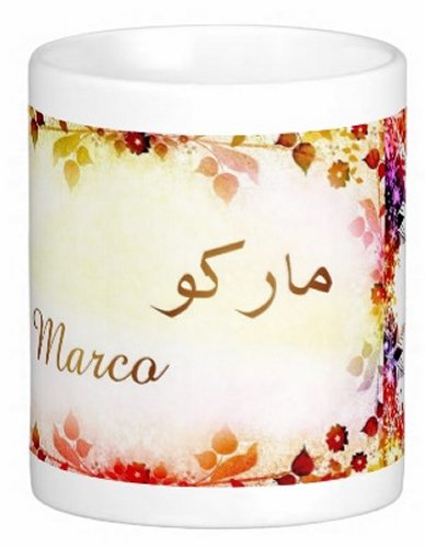 Mug avec le prénom "Marco" écrit en français, en arabe (ماركو) et calligraphié de façon artistique en arabe sur la partie droite.