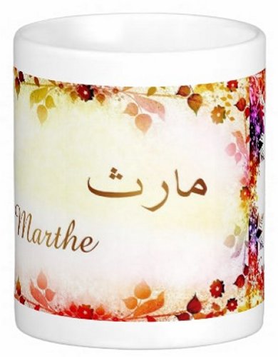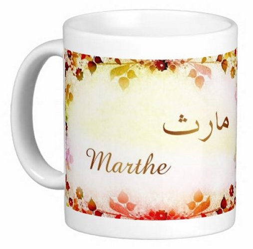 Mug avec le prénom "Marthe" écrit en français, en arabe (مارث) et calligraphié de façon artistique en arabe sur la partie droite.