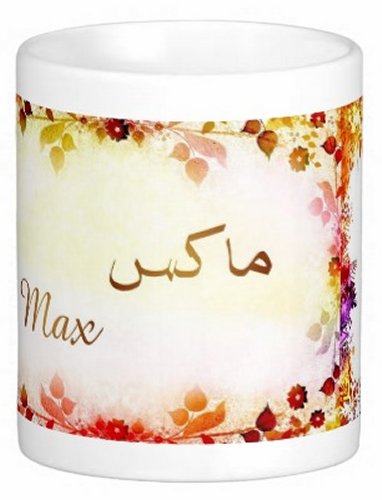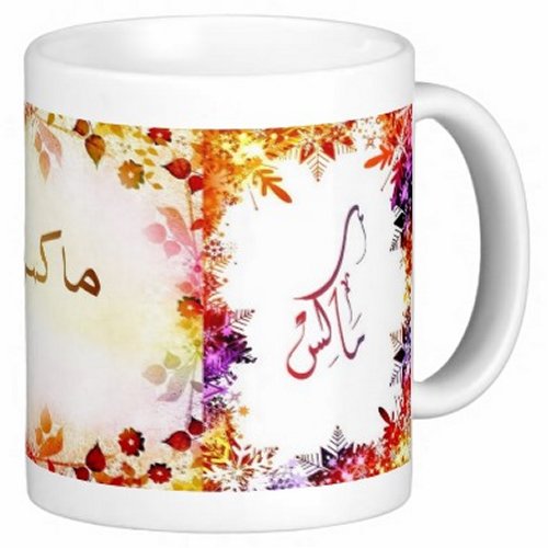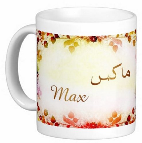 Mug avec le prénom "Max" écrit en français, en arabe (ماكس) et calligraphié de façon artistique en arabe sur la partie droite.