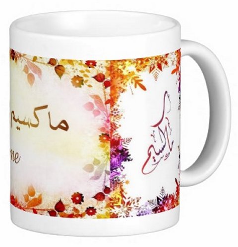 Mug avec le prénom "Maxime" écrit en français, en arabe (ماكسيم) et calligraphié de façon artistique en arabe sur la partie droite.