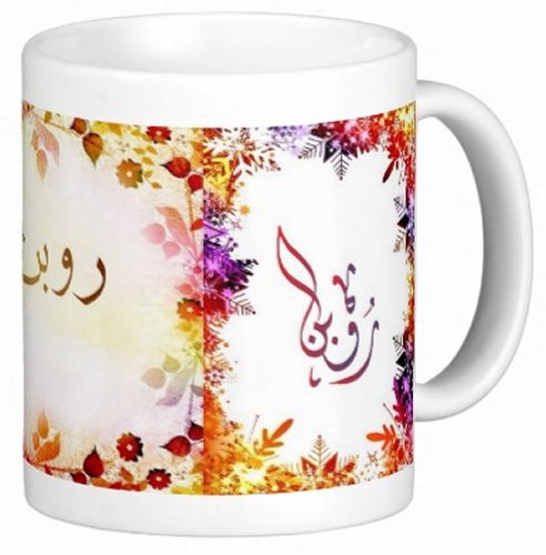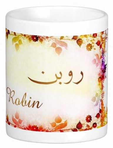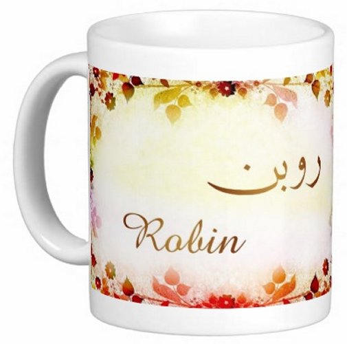Mug avec le prénom "Robin" écrit en français, en arabe (روبن) et calligraphié de façon artistique en arabe sur la partie droite.