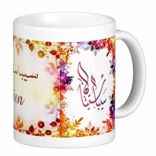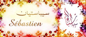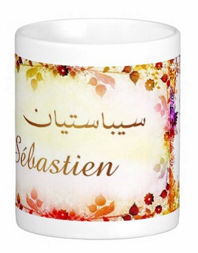 Mug avec le prénom "Sébastien" écrit en français, en arabe (سيباستيان) et calligraphié de façon artistique en arabe sur la partie droite.