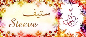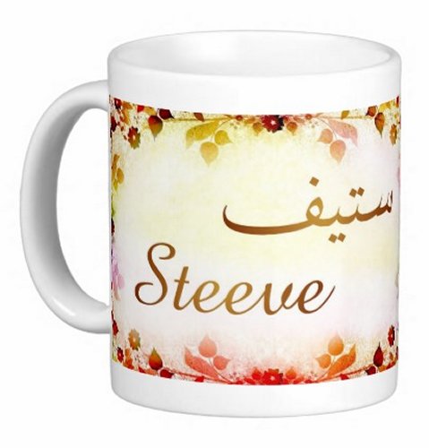 Mug avec le prénom "Steeve" écrit en français, en arabe (ستيف) et calligraphié de façon artistique en arabe sur la partie droite.