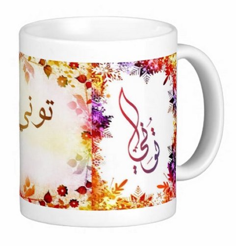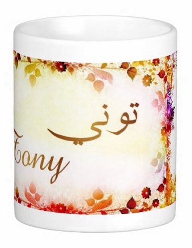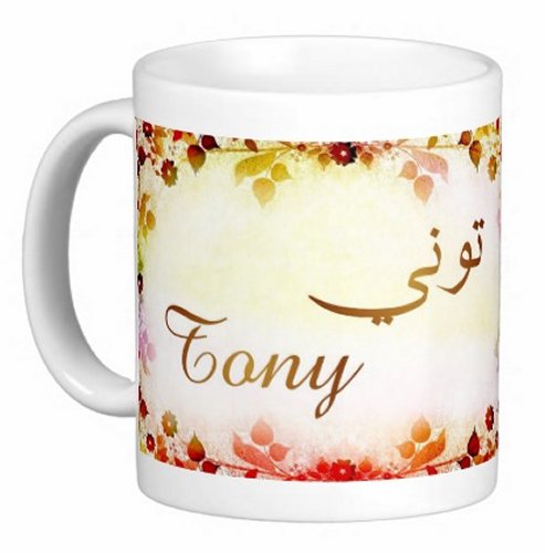 Mug avec le prénom "Tony" écrit en français, en arabe (توني) et calligraphié de façon artistique en arabe sur la partie droite.