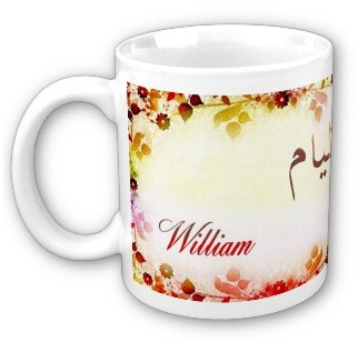 Mug avec le prénom "William" calligraphié en arabe (وليام) ainsi que son épellation lettre par lettre en arabe.