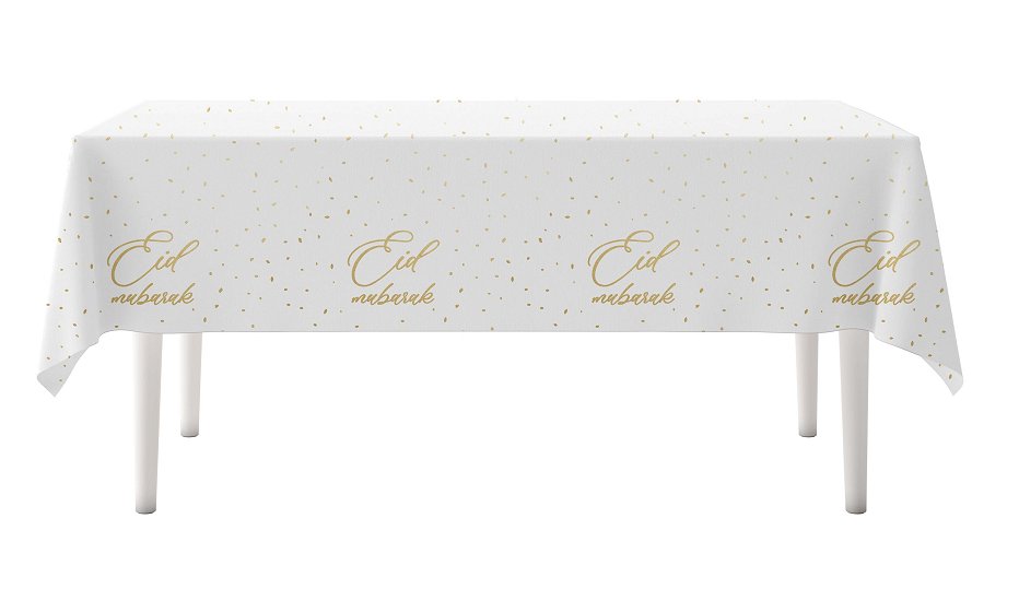 Cette belle nappe Eid Mubarak complètera votre décoration Eid ! La nappe est blanche et contient des lettres et des accents dorés.