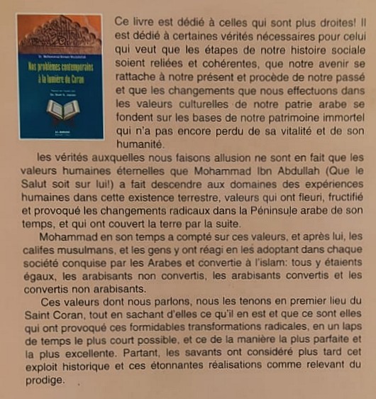 Notre avenir se rattache à notre présent et s'inscrit dans notre passé. Les vérités auxquelles nous faisons allusion ne sont en fait, que des valeurs intrinsèquement humaines que Mohammad Ibn Abdullah (Que le Salut soit sur lui) a fait fleurir, fructifier,provoquant des changements radicaux dans la Péninsule arabique et qui,par la suite se sont propagées sur la Terre, portées par le prophète Mohamed et après lui, par les califes de l'Islam.Ces valeurs ont été adoptées dans chaque sociétés conquises et converties à l´islam. Ces valeurs dont nous parlons, nous les tenons d'abord et avant tout, du Saint Coran,qui, par ses effets,à provoqué ces formidables transformations radicales, en un laps de temps très court,chose unique dans l'Histoire de l'humanité,car relevant du prodige.