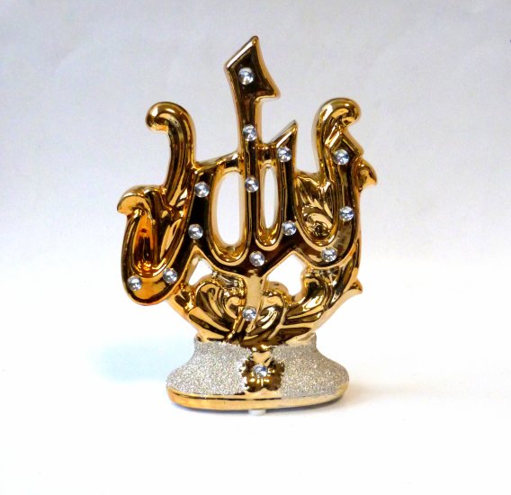 Objet decoratif en porcelaine doree avec calligraphie Allah decore de diamants