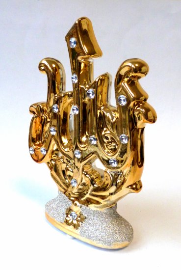 Garniture en porcelaine dorée avec calligraphie Allah décoré de diamants et la base est recouverte d'une poudre argentée.