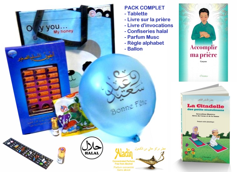Pack Cadeau Petit Musulman : Tablette - Livres de prière et d'invocations - Bonbons Halal - Parfum Musc - Ballon Règle alphabet (Spécial garçons) - REF. 23797 (19.90 €)