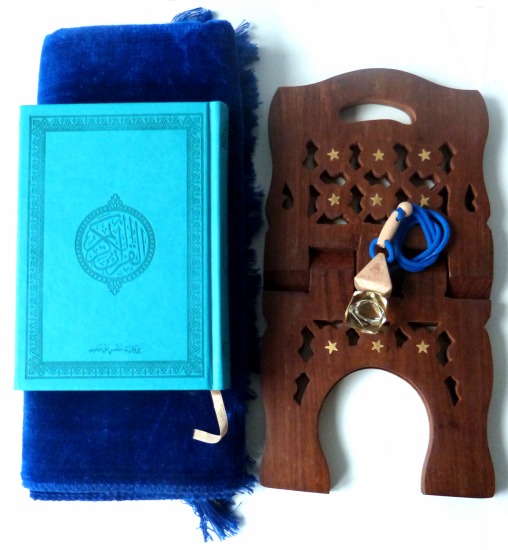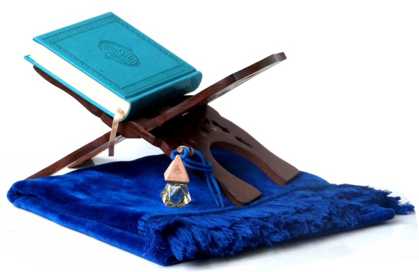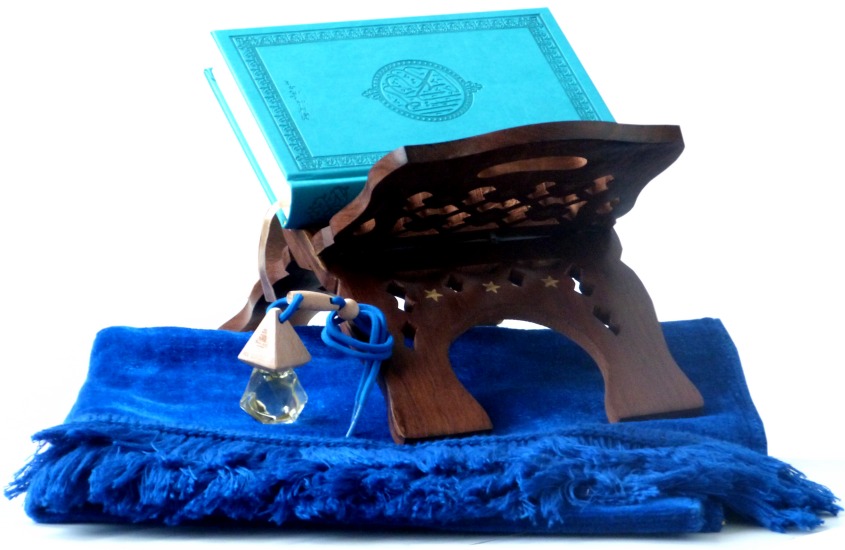 Pack Cadeau Priere Bleu : Le Saint Coran (arabe), Porte Coran, Tapis en velours et Diffuseur de parfum