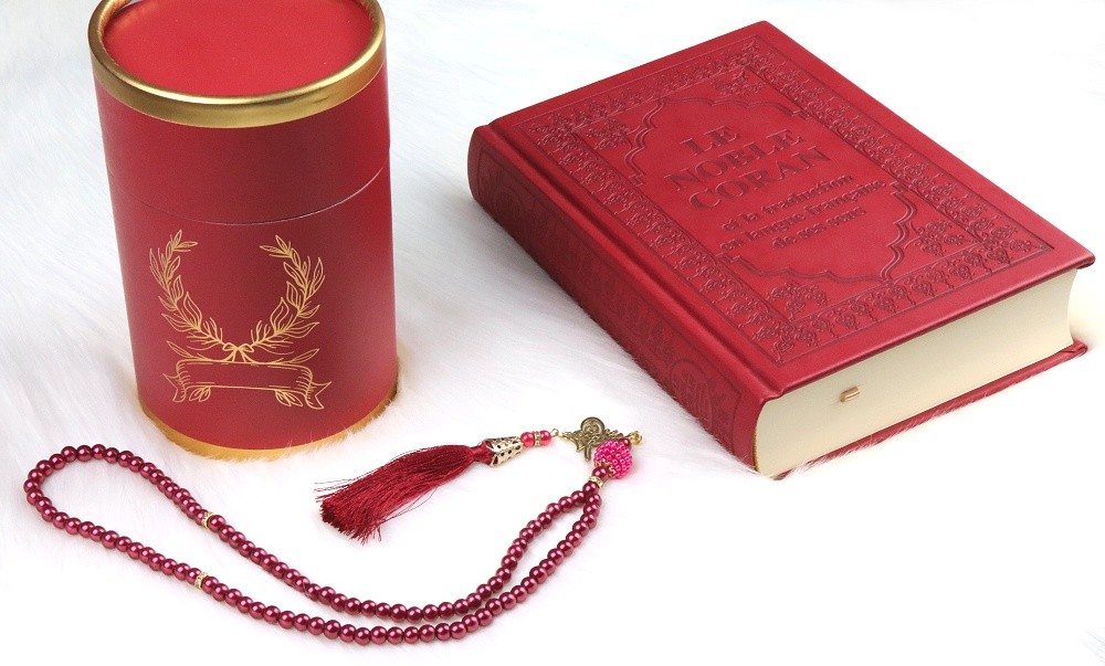 La boite ronde est accompagnée du livre Le Noble Coran et la traduction en langue française de ses sens (bilingue français/arabe) - Edition de luxe couverture cartonnée en cuir rouge bordeaux