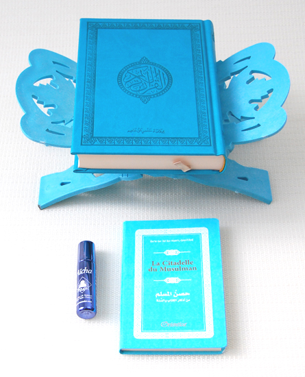 Pack Cadeau Bleu (mixte) : Le Saint Coran arabe avec couverture cuir de luxe + La Citadelle du musulman (fr/ar/ph) + Porte Coran en bois sculpté + Parfum Musc d'Or de luxe (avec étui doré) au choix - REF. 23094 (29.90 €)