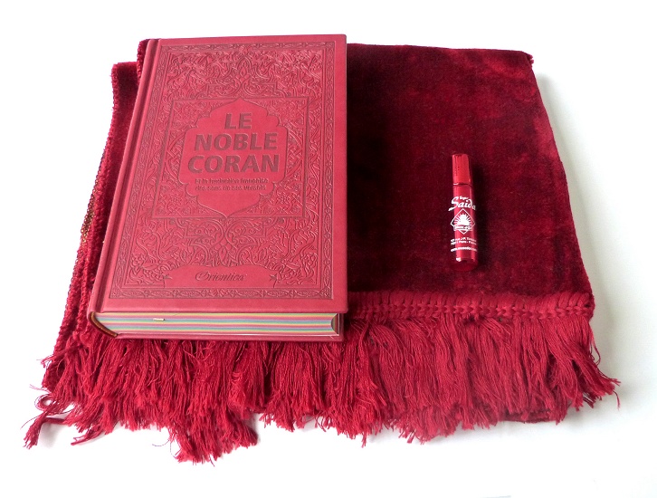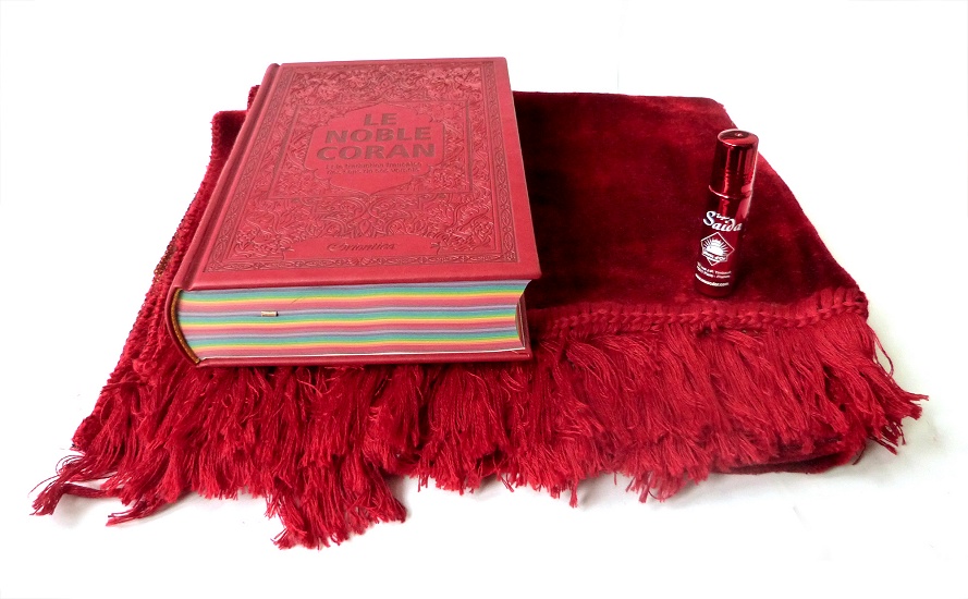 Pack Cadeau bordeaux assorti : Le Noble Coran Arc-en-ciel (Rainbow français-arabe) avec tapis uni et parfum Musc d'Or de luxe "Meriem" - REF. 24455 (32.00 €)