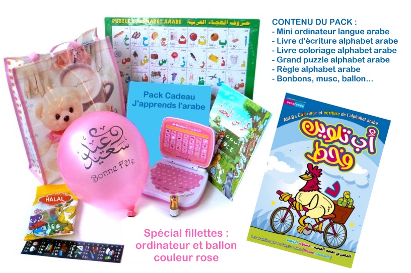Pack j'apprends l'arabe pour les enfants spécial fillettes constitué des éléments suivants :