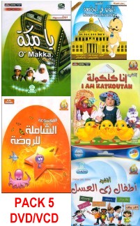 Pack constitué de 5 DVD/VCD de chants en langue arabe pour les enfants de 1 à 5 ans.