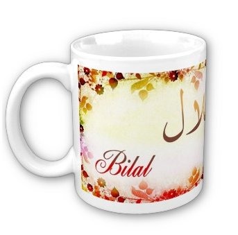 Pack constitué du Parfum (3 ml) "Bilal" et du Mug avec le prénom "Bilal" écrit en français, en arabe (بلال) et calligraphié de façon artistique en arabe sur la partie droite.