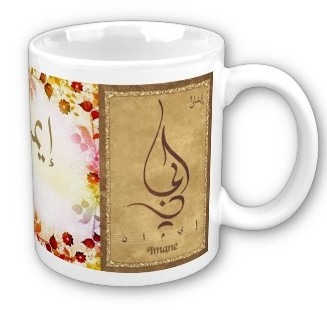 Pack constitué du Parfum (3 ml) "Imane" et du Mug avec le prénom "Imane" écrit en français, en arabe (إيمان) et calligraphié de façon artistique en arabe sur la partie droite.