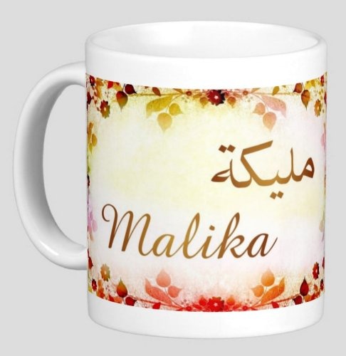Pack constitué du Parfum (3 ml) "Malika" et du Mug avec le prénom "Malika" écrit en français, en arabe (مليكة) et calligraphié de façon artistique en arabe sur la partie droite.