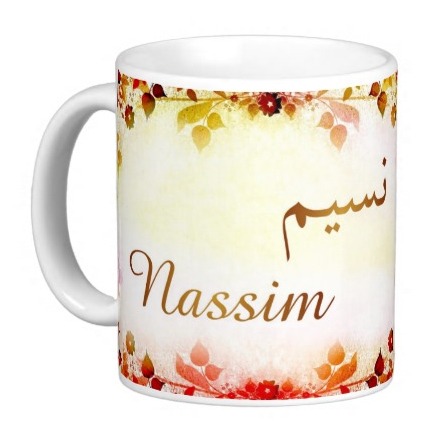 Pack constitué du Parfum (3 ml) "Nassim" et du Mug avec le prénom "Nassim" écrit en français, en arabe (نسيم) et calligraphié de façon artistique en arabe sur la partie droite.