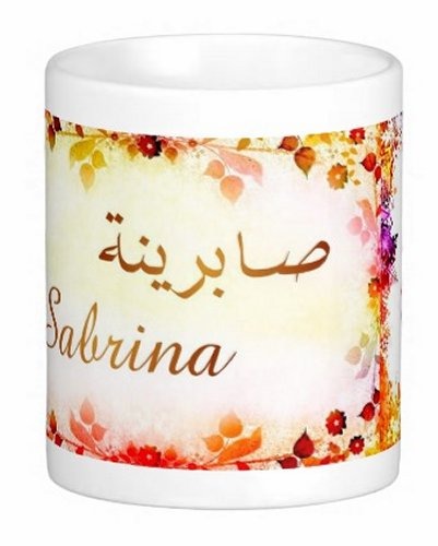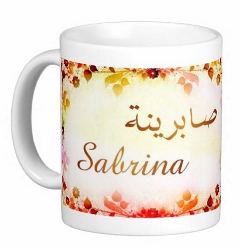 Pack constitué du Parfum (3 ml) "Sabrina" et du Mug avec le prénom "Sabrina" écrit en français, en arabe (صابرينة) et calligraphié de façon artistique en arabe sur la partie droite.