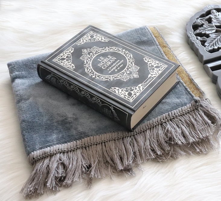 Pack cadeau Gris : Le Noble Coran bilingue français/arabe (édition de luxe en daim argenté) + Tapis en velours couleur unie assortie (Coffret Muslim pour homme) Deco & Cadeau