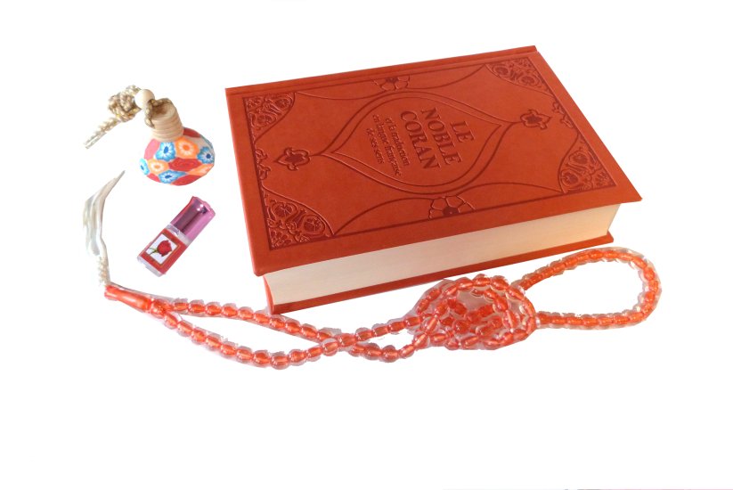Pack Cadeau Orange : Résumé de "Zâd Al-ma'âd", "La citadelle du musulman", Porte Coran doré, et parfum avec pochette dorée - REF. 25674 (36.00 €)