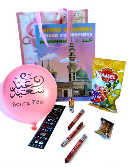 Pack Cadeau Enfant : Livre Les Histoires des Prophètes Racontées aux Enfants + Confiseries Bonbons Halal + Tapis de prière enfant + 10 ballons "Aïd Moubarak" - REF. 23172 (24.00 €)