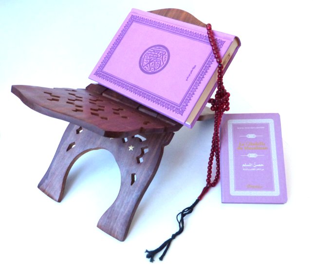 Pack Cadeau constitué d'un Coran arabe couverture similicuir de luxe (mauve) + Porte Coran en bois sculpté et décoré + Parfum Musc d'Or de luxe "Rouh Al-Musc" (8 ml) - REF. 23000 (28.00 €)