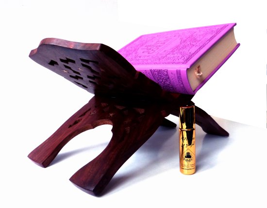 Pack Cadeau constitué d'un Coran arabe couverture similicuir de luxe (mauve) + Porte Coran en bois sculpté et décoré + Parfum Musc d'Or de luxe "Rouh Al-Musc" (8 ml) - REF. 23000 (28.00 €) |