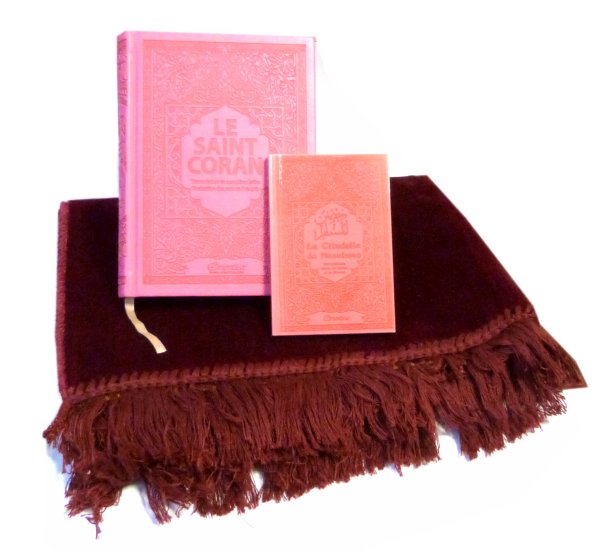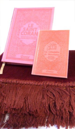 Pack cadeau rose : Le Saint Coran (francais/arabe/phonetique) + La Citadelle du musulman (Hisnul Muslim) + Tapis de priere en velours